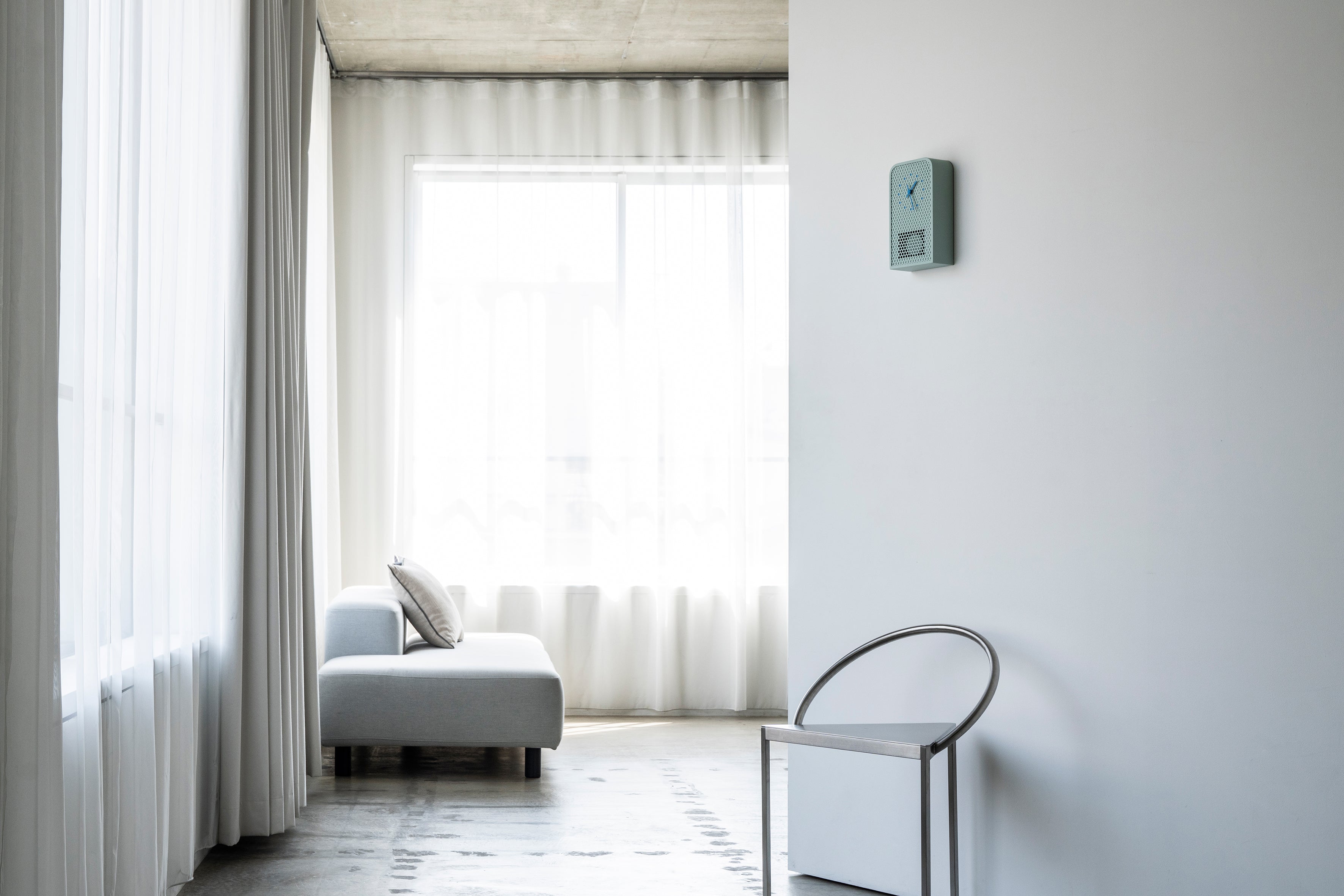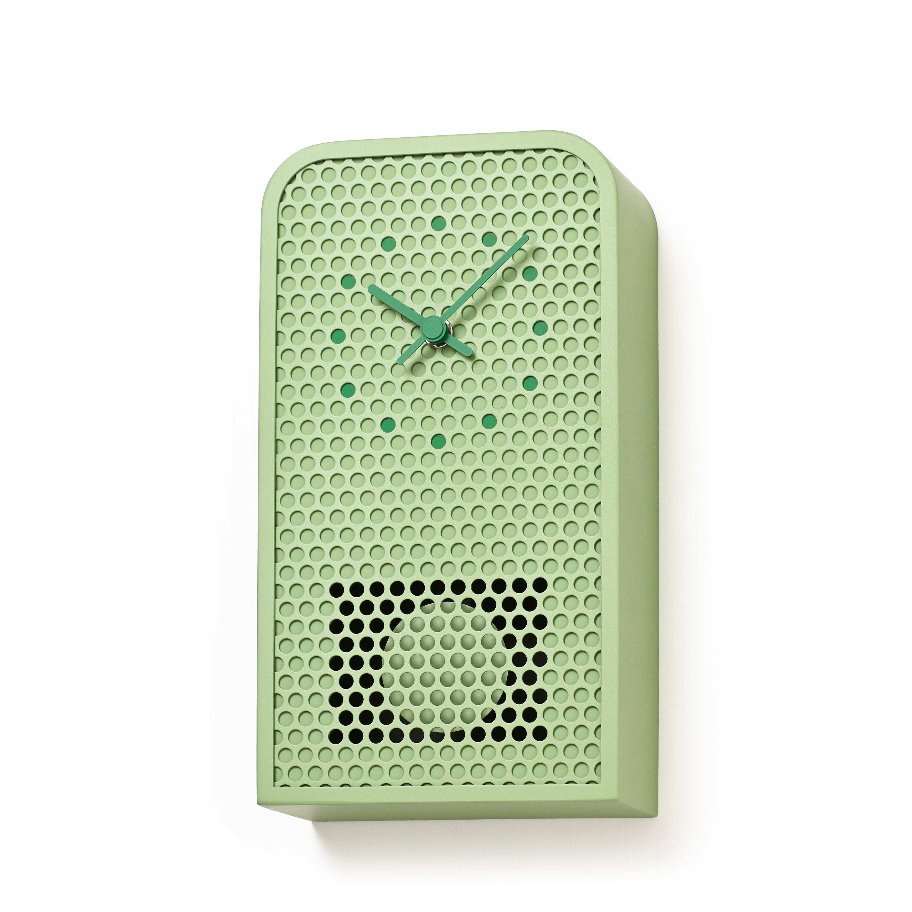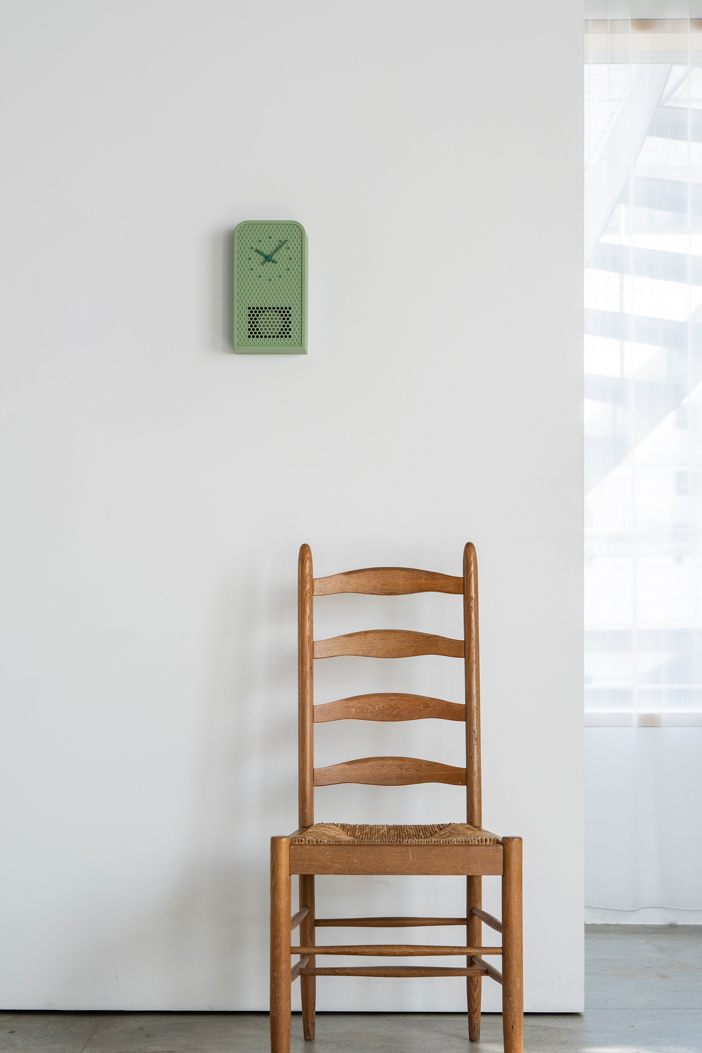 The clock’s indexes are precisely aligned with selected cutouts and finished in complementary tones, creating a seamless connection between form and function. The clocks come in 4 colorways, white, ivory, mint blue, and green, neutral calming colors that are versatile in a range of interiors. An accent color in a more saturated tones highlights the hands and indexes, adding subtle vibrancy without overwhelming the design.